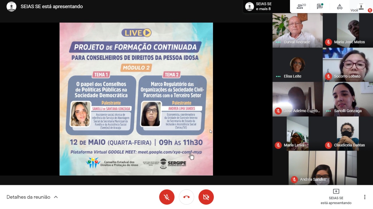Nesta quarta-feira (12), aconteceu o segundo módulo do Projeto de Formação Continuada para os conselheiros estaduais e municipais de Direitos da Pessoa Idosa em Sergipe. No encontro virtual, realizado pelo Google Meet, foram abordados dois temas importantes para o controle social: “O papel dos Conselhos de Políticas Públicas na sociedade Democrática” e o “Marco Regulatório das Organizações da Sociedade Civil – Parcerias com o Terceiro Setor”. O Projeto de Formação é promovido pela Diretoria de Inclusão e Direitos Humanos (DIDH) da Secretaria de Estado da Inclusão e Assistência Social (SEIAS), em parceria com o Conselho Estadual dos Direitos e Proteção ao Idoso (CEDiPI) e com a Secretaria de Estado da Saúde (SES). O terceiro módulo já tem data marcada para o dia 10 de junho.