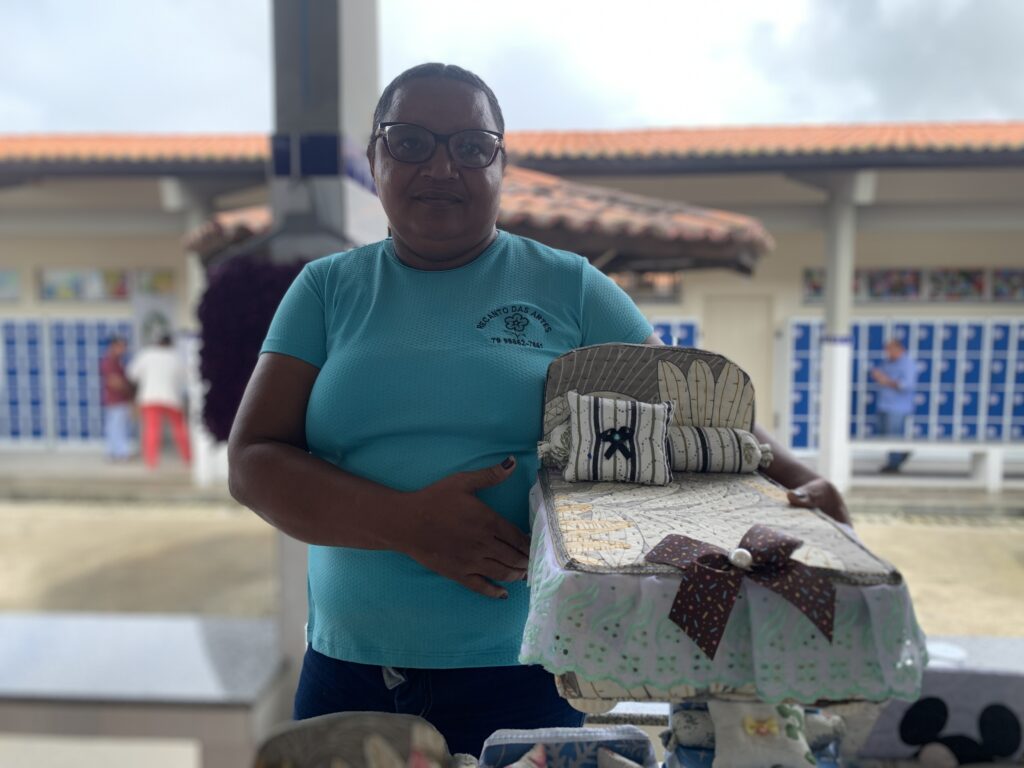 A artesã Maria Luísa de Jesus expôs sua produção no espaço de Inclusão Produtiva. “O artesanato foi o que me tirou de uma depressão. Já são 14 anos transformando papelão, tecido e EVA em arte, e isso, hoje, também faz parte da minha renda e esse espaço me deu visibilidade para ir mais longe”, relatou.