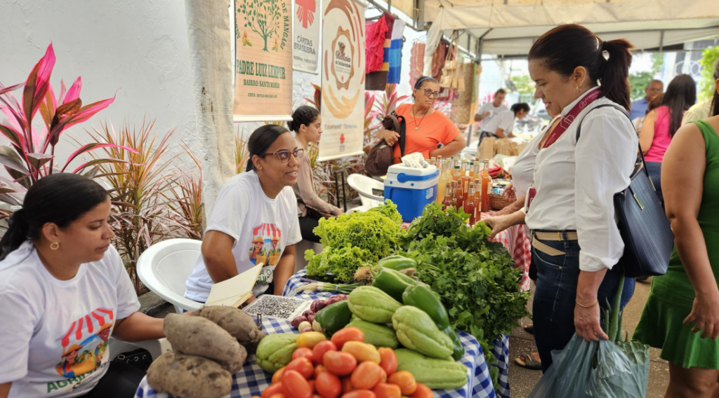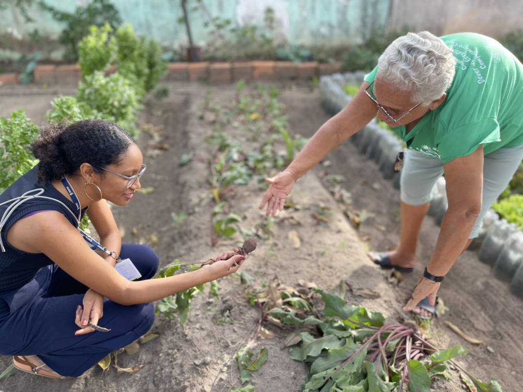 No Espaço Cuidar Santa Maria, a horta comunitária já faz parte do cotidiano dos moradores. Milho, pimentão, alface, tomate e couve são alguns dos alimentos colhidos, e os participantes já estão comercializando os itens na Feira da Agricultura Familiar da Seasic desde o mês de julho.
