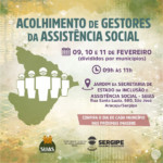 Diante da chegada das novas gestões municipais, a Secretaria de Estado da Inclusão e Assistência Social (SEIAS) realizará, nos dias 09, 10 e 11 de fevereiro, o Acolhimento de Gestores da Assistência Social, no horário das 09h às 11h. Em local aberto, o evento acontecerá no pátio do jardim da SEIAS [localizada na Rua Santa Luzia, 680, bairro São José, em Aracaju], e terá limite de pessoas, com a participação dos municípios sergipanos separados por datas. Será obrigatório o uso de máscaras respiratórias e distanciamento social. Os gestores que não puderem comparecer presencialmente, também poderão acompanhar o acolhimento de forma virtual através de transmissão fechada.